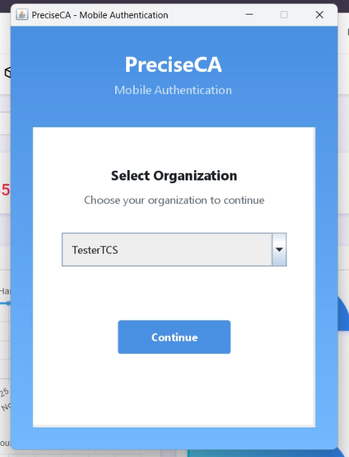 From the dropdown, select the organization linked to your PreciseCA account (e.g., TesterTCS).